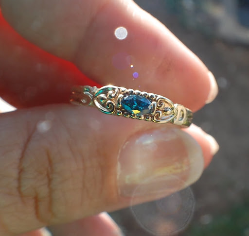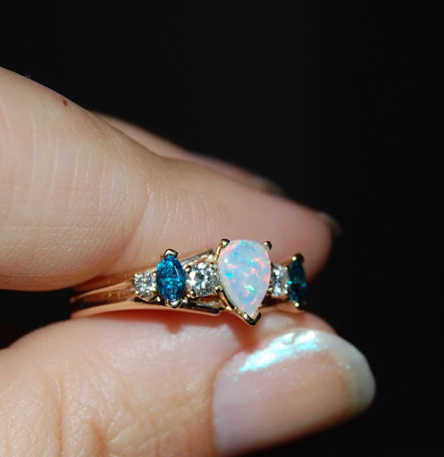 I told him later that I should have known he was up to something because the date was 10/10/10 and he’s all about the numbers. He said he had originally planned to wait until Halloween, but he couldn’t pass up 10/10/10 as a once in a life time date. Also apparently 101010 in binary code = 42. 42 is the answer to the question to of "Life, the universe, and everything." 42My ring is custom designed and made. Daniel bought the opal 10 years ago thinking to use it as an engagement ring. It has 4 round white diamonds and 3 marquee blue diamonds. The third blue diamond is on the palm side of the band. There is a scrolled heart and our initials on each side of the back diamond. There are 8 stones all together because we met 8 years ago.